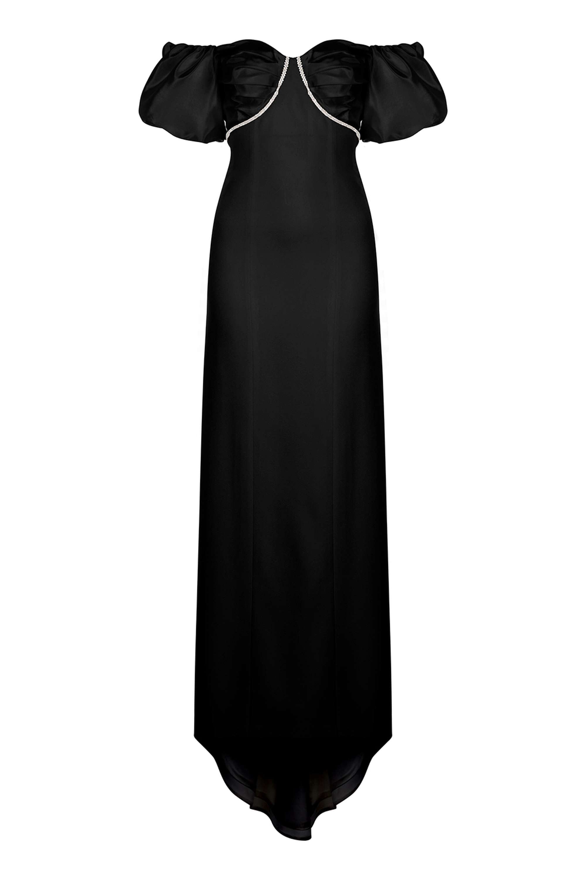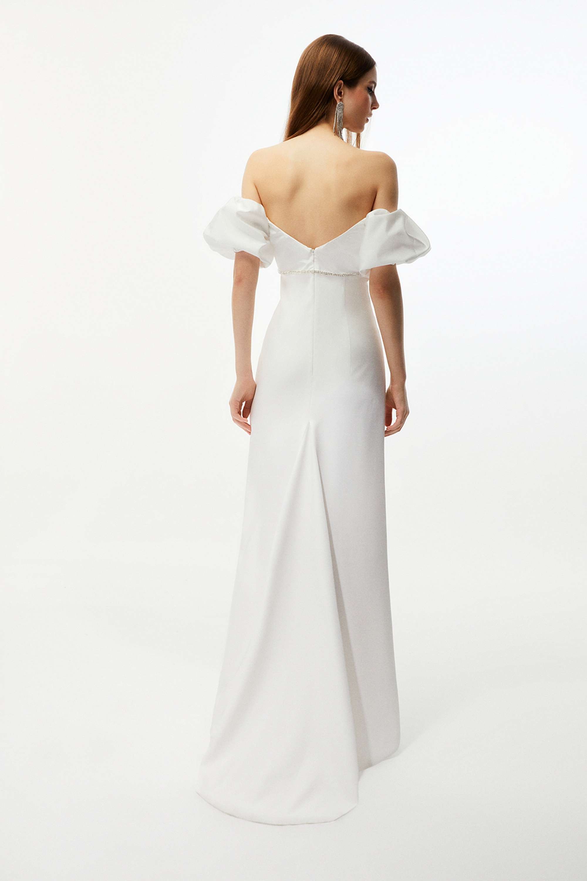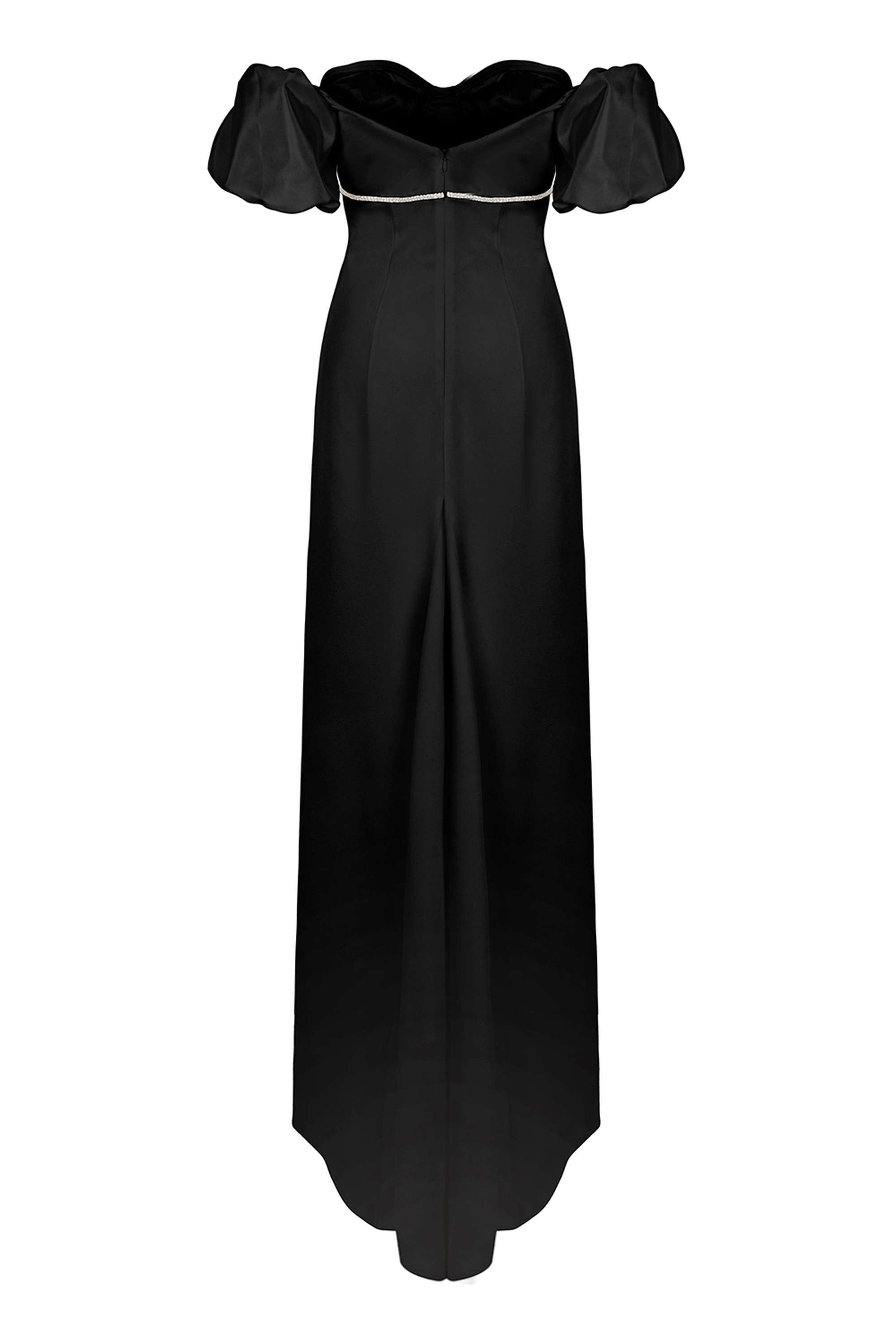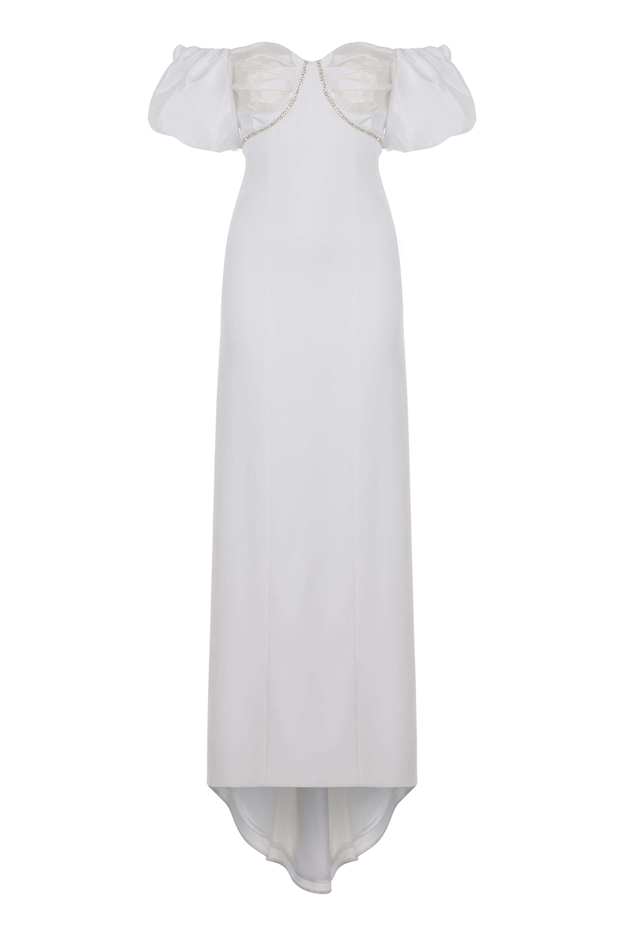 Long train dress with short balloon sleeves and pleat detail, inner lining, embellished with rhinestones, zip closure