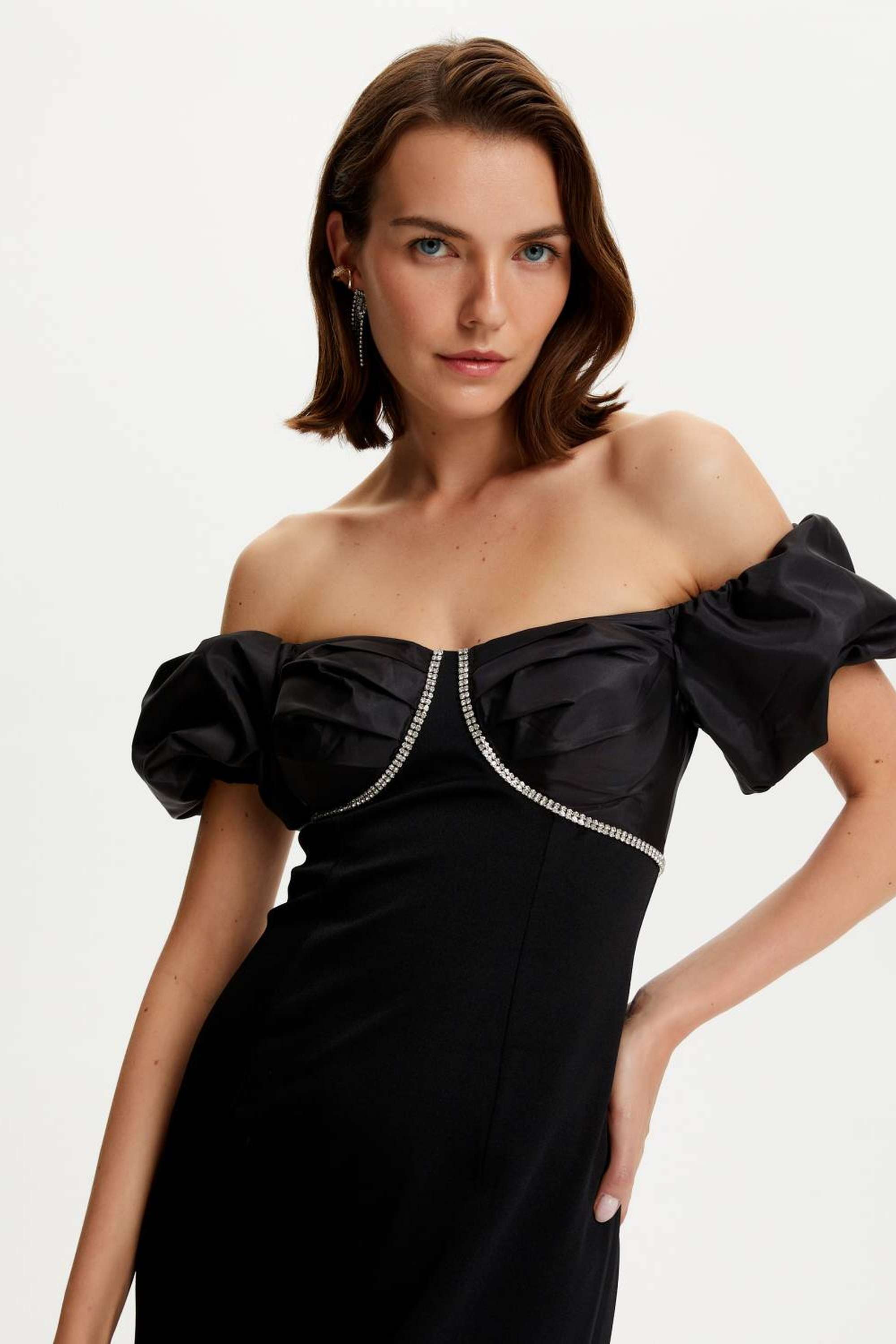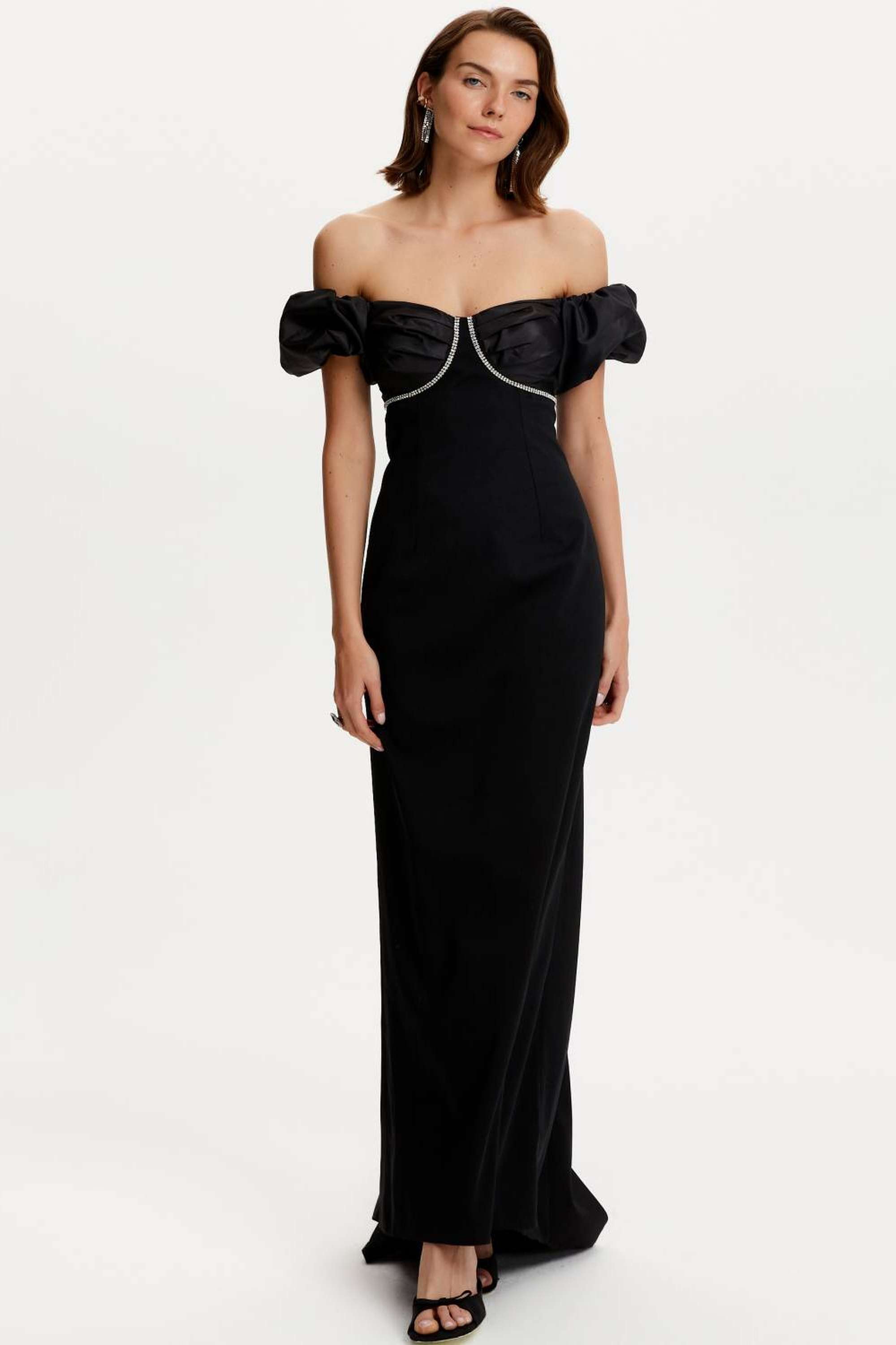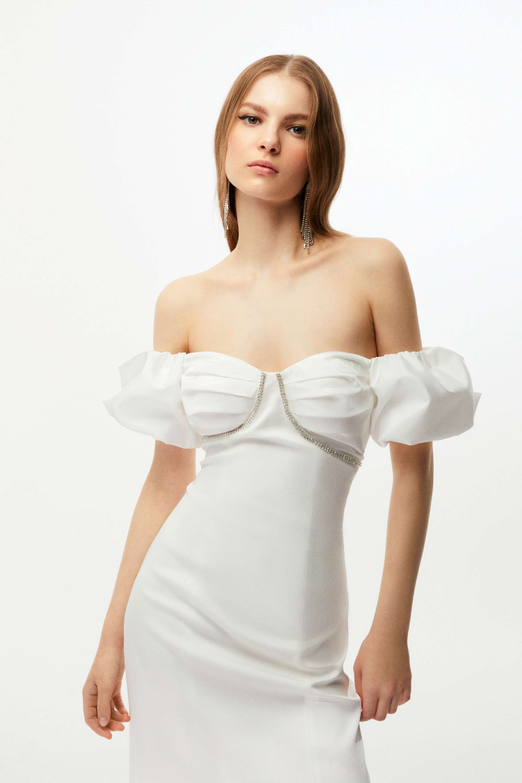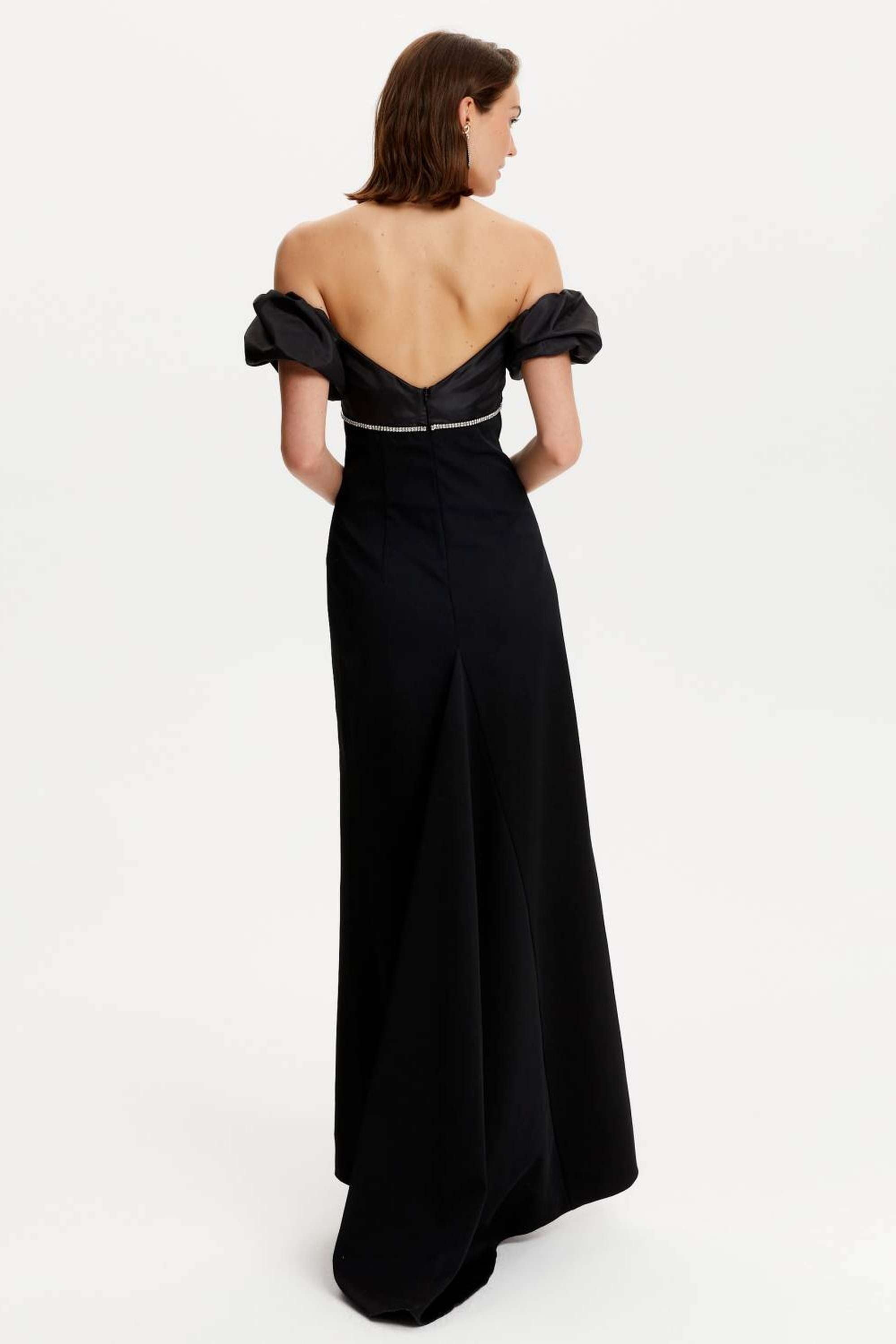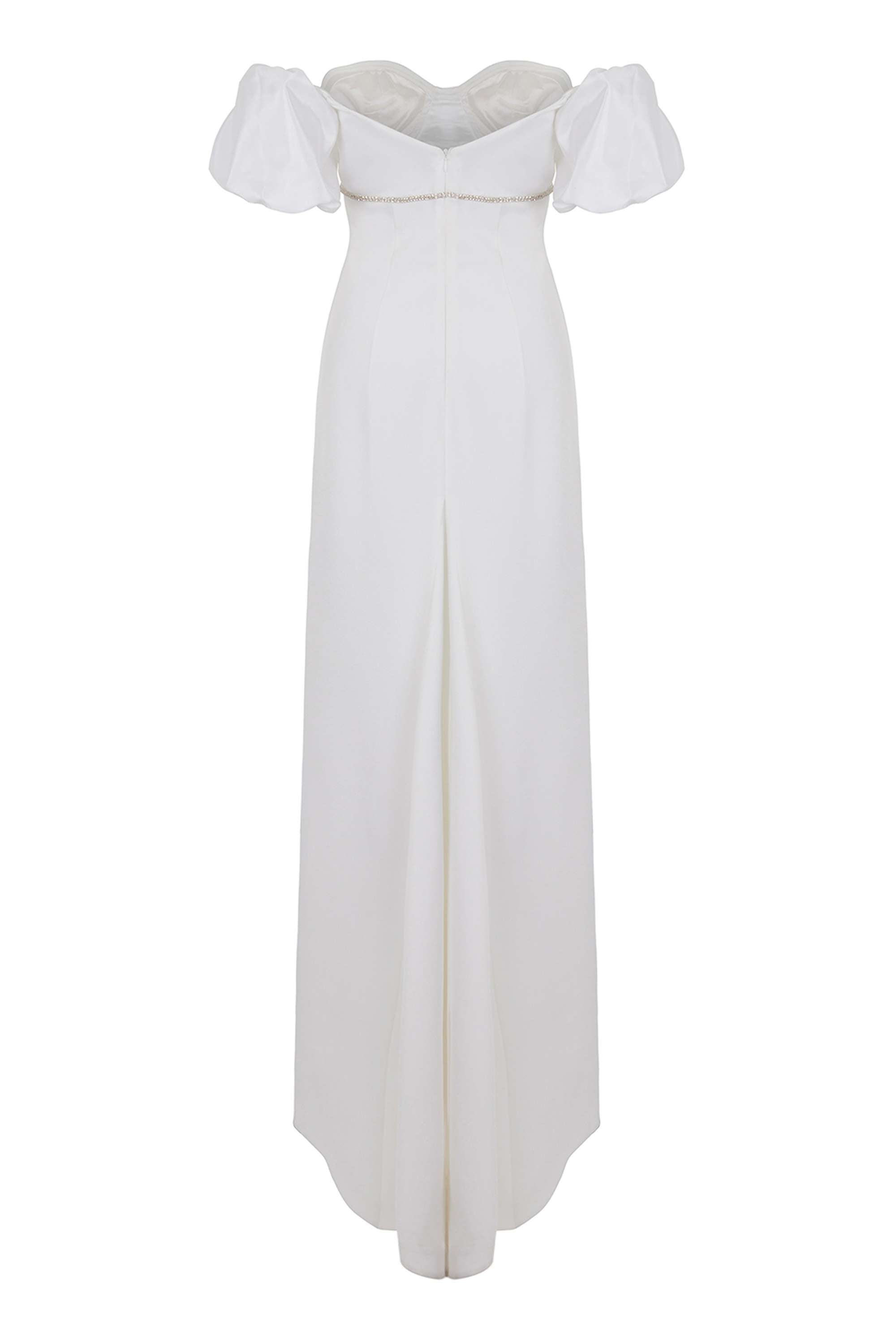 Long train dress with short balloon sleeves and pleat detail, inner lining, embellished with rhinestones, zip closure
