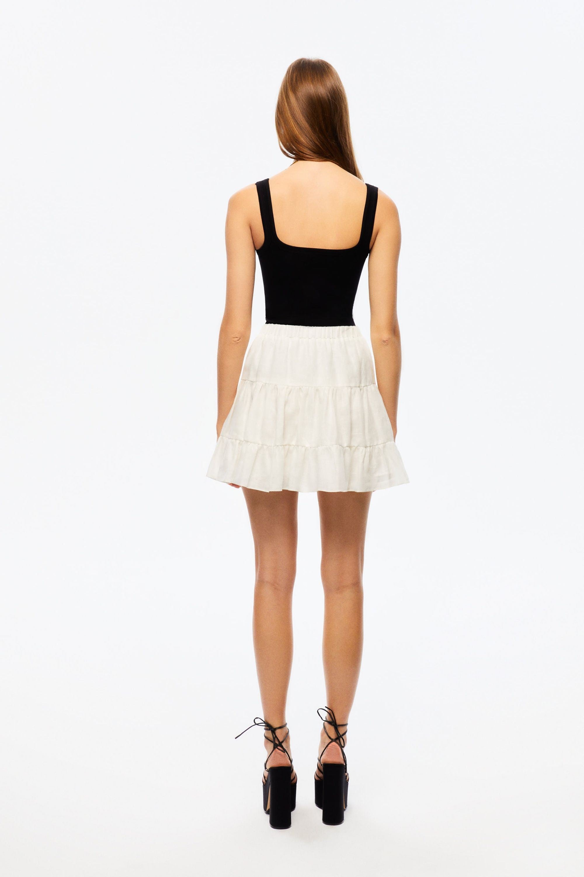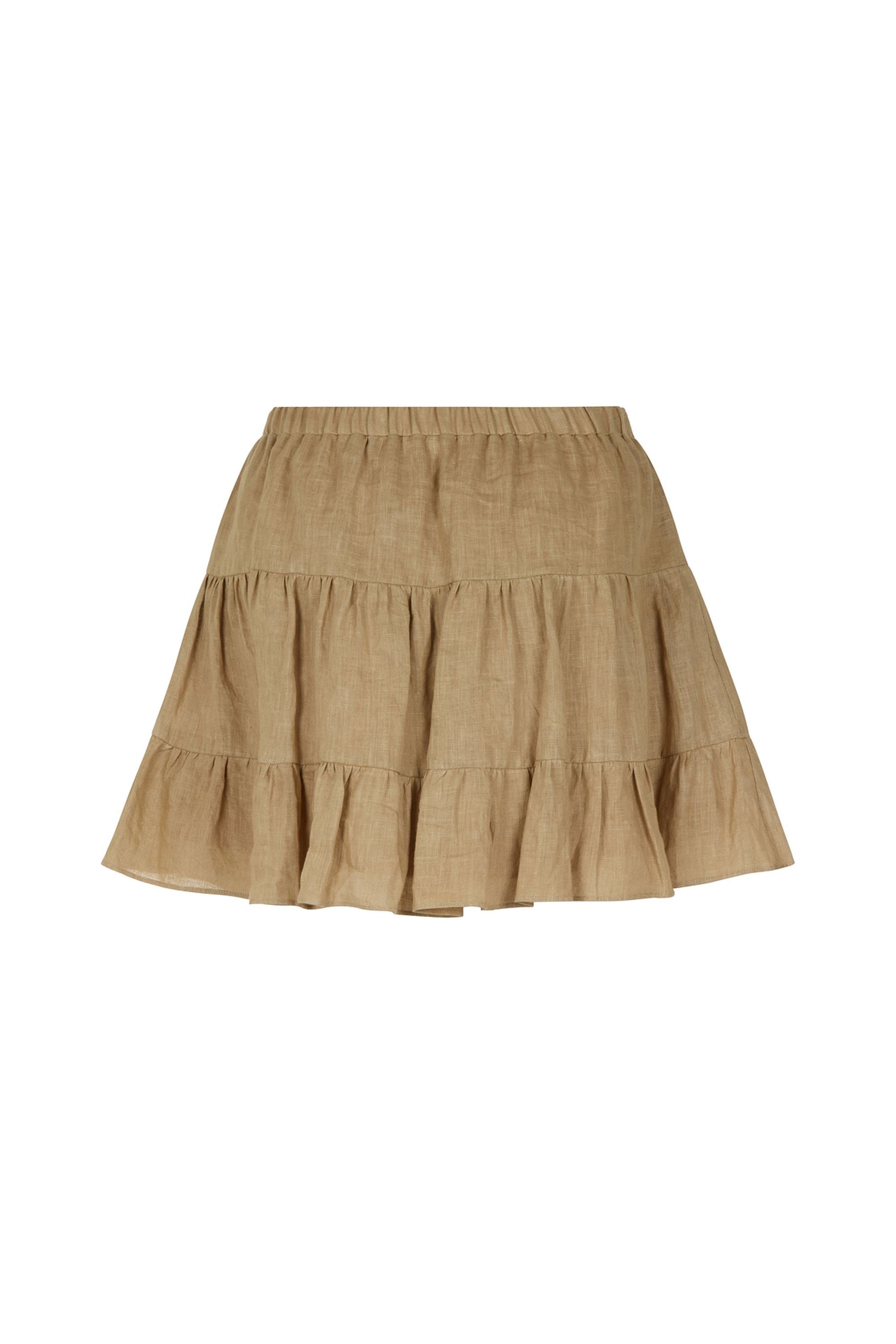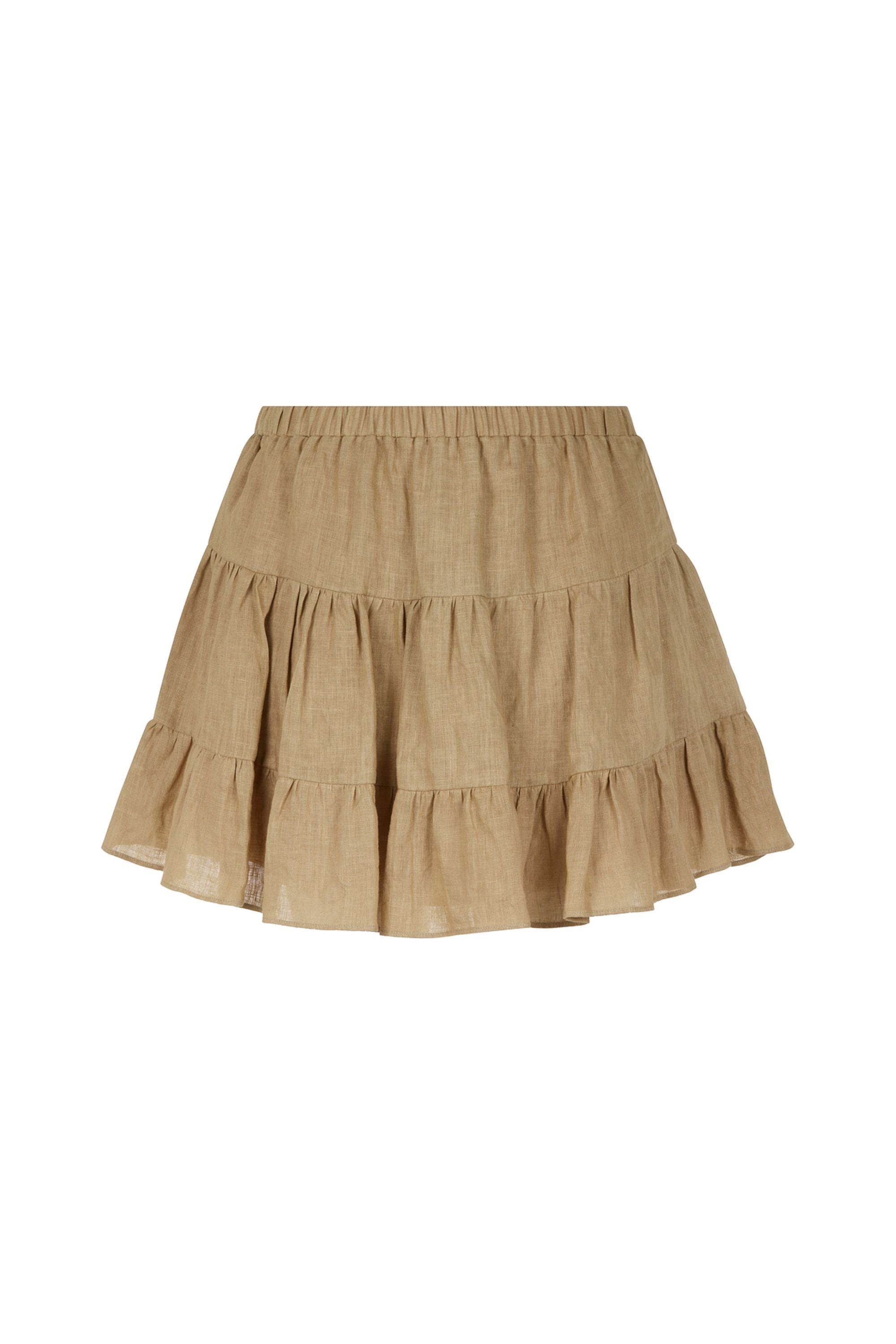 Description: Flounced linen mini skirt with elastic waistband.