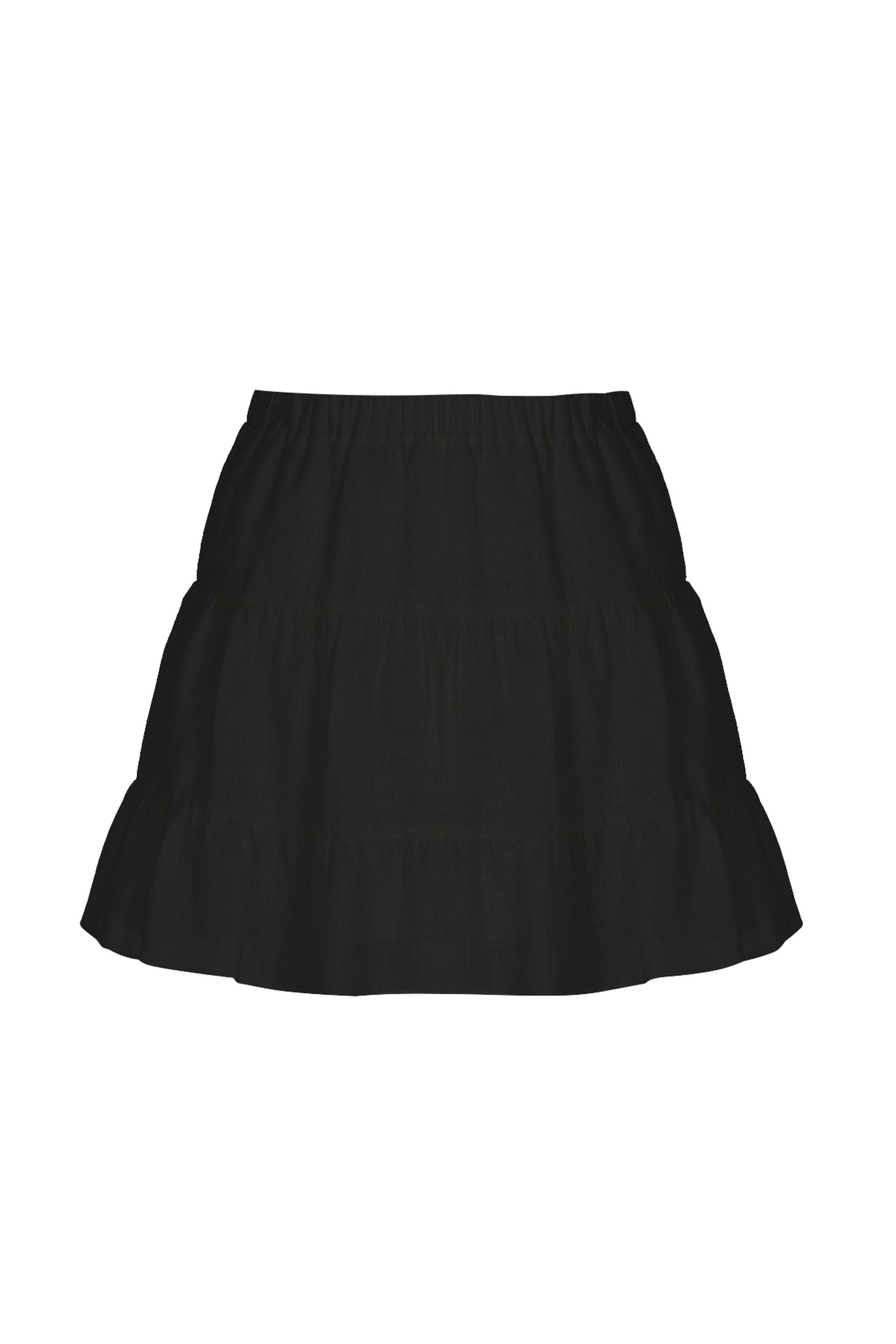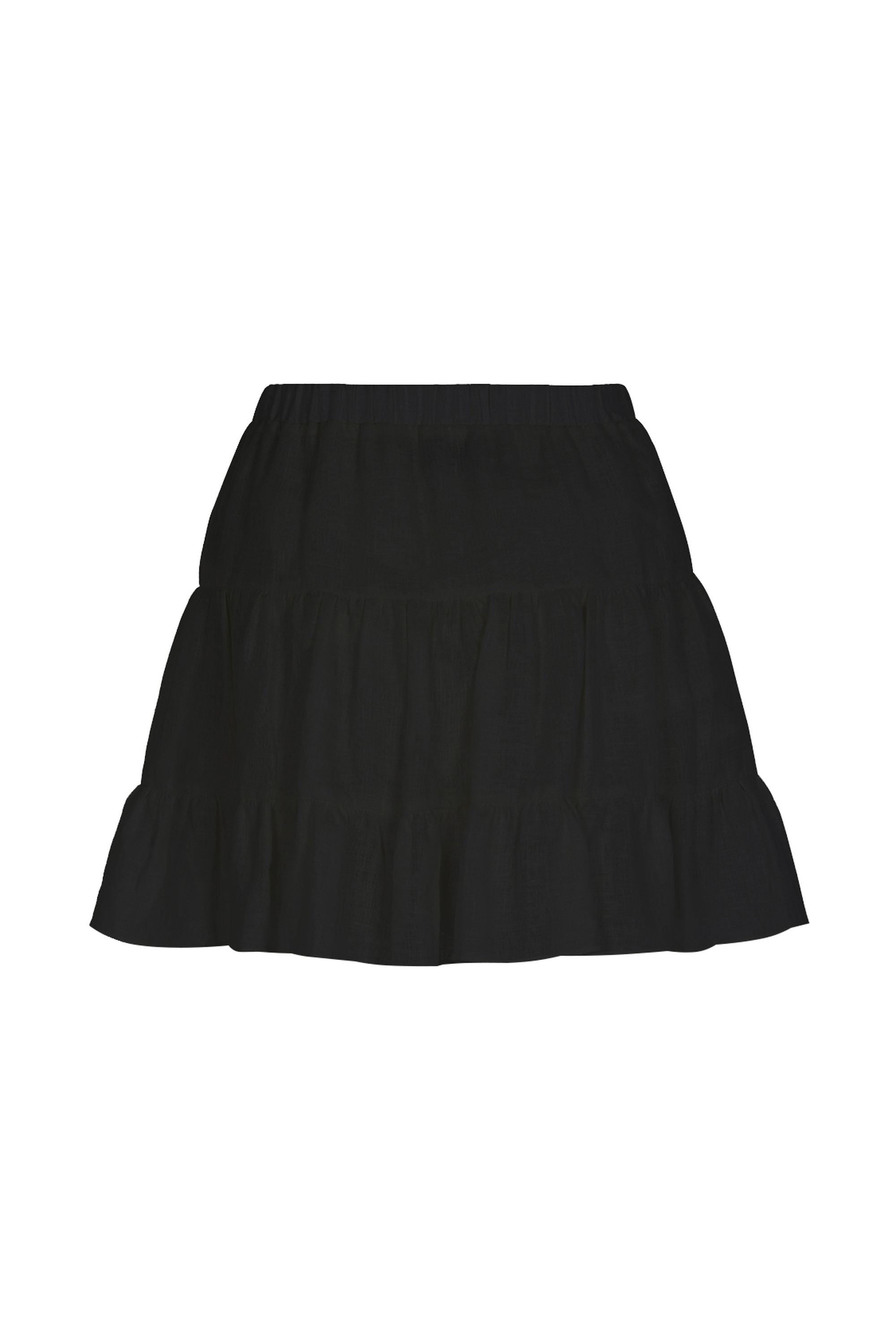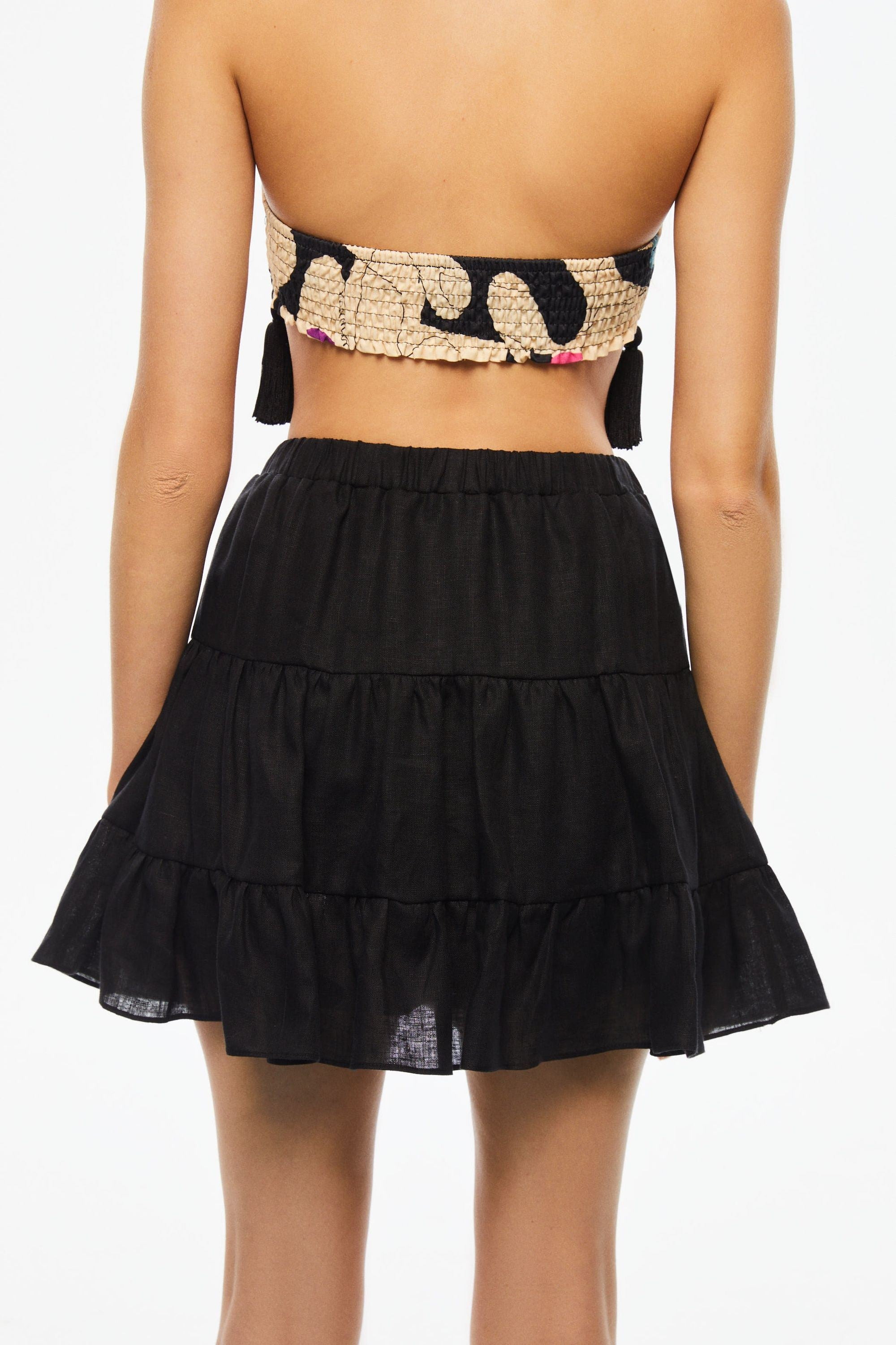Description: Flounced linen mini skirt with elastic waistband.