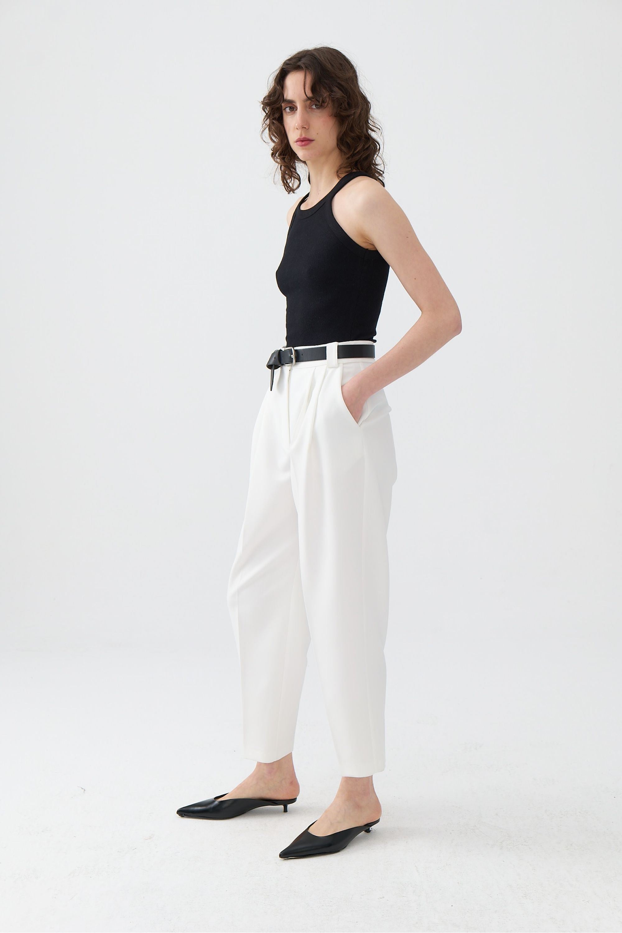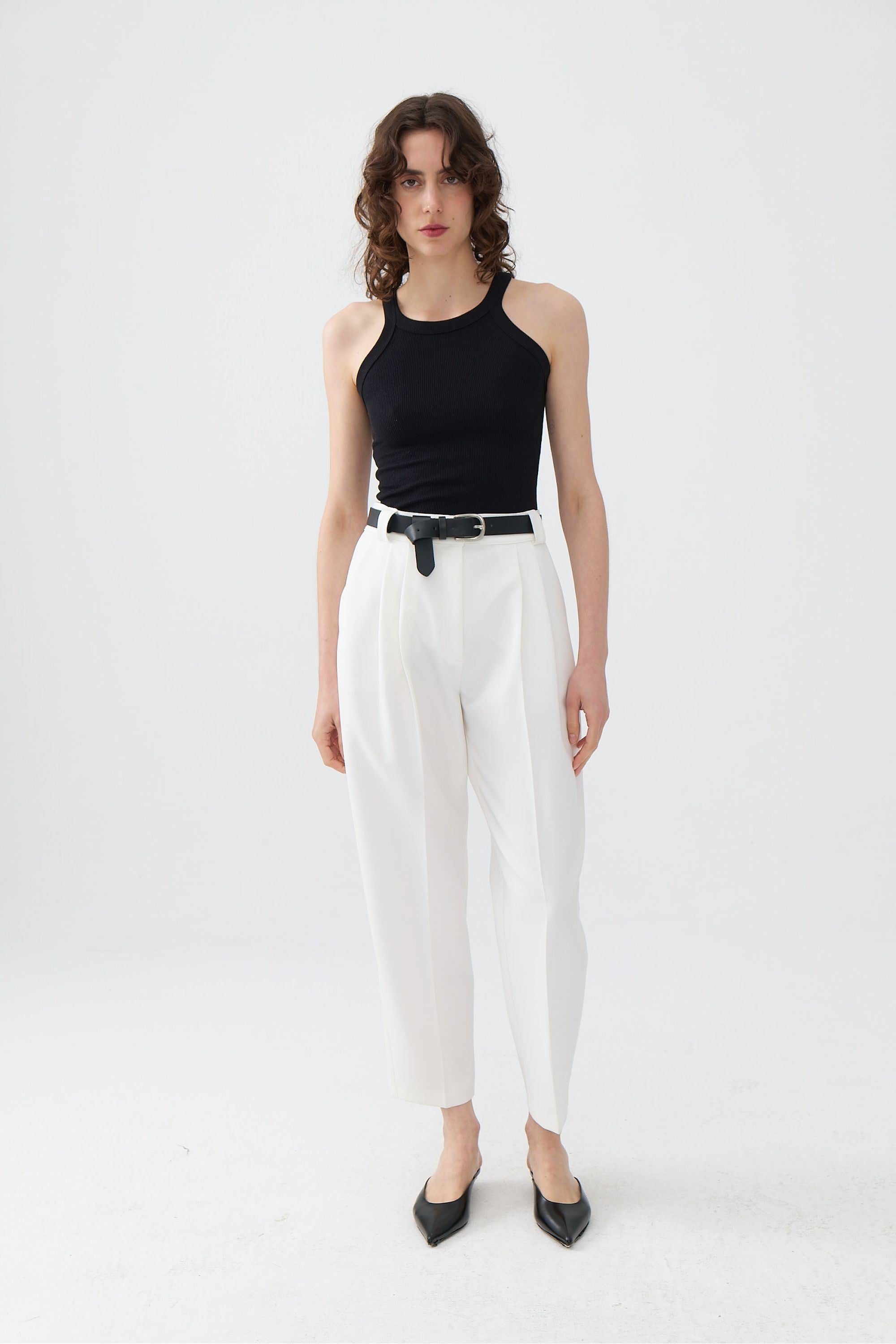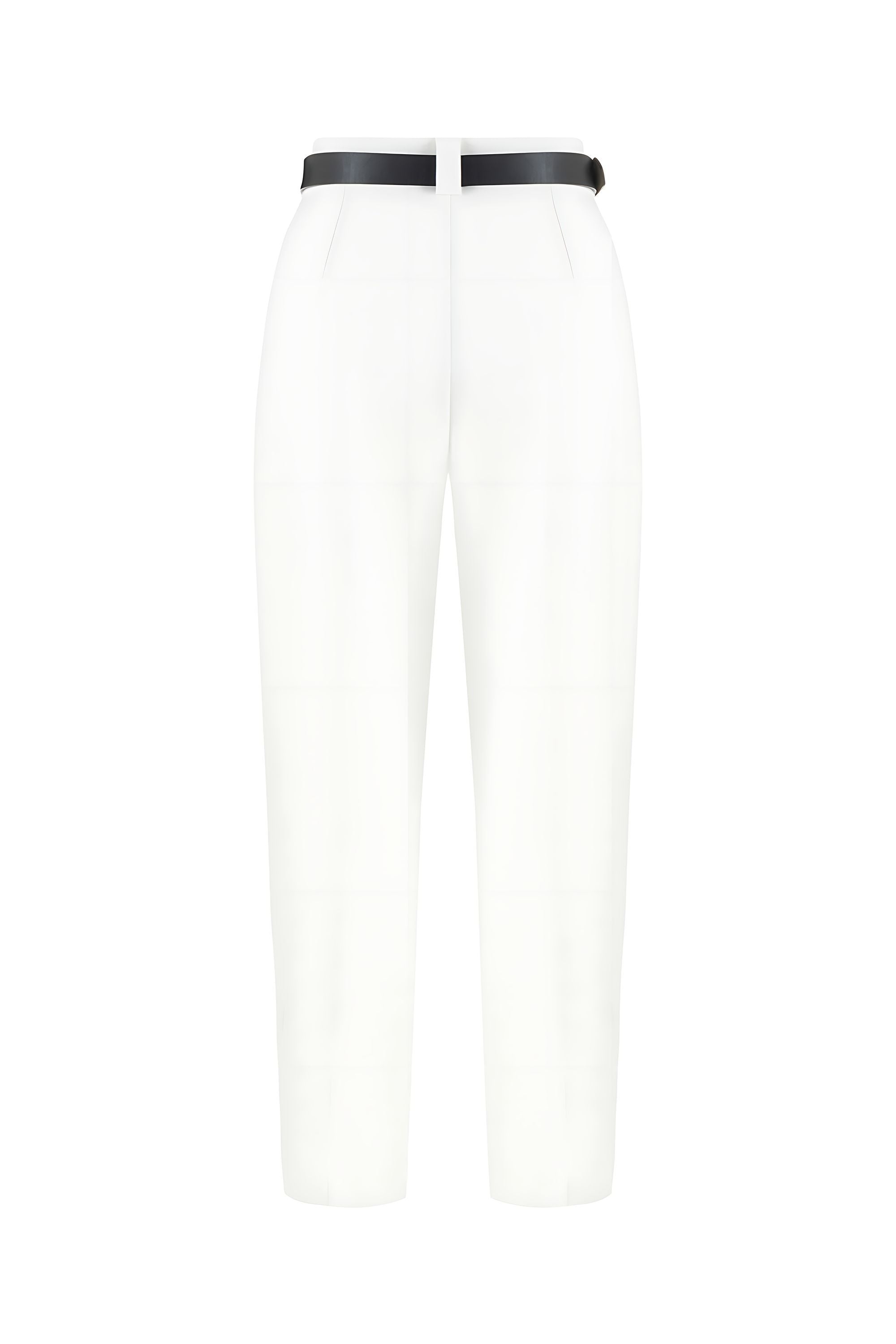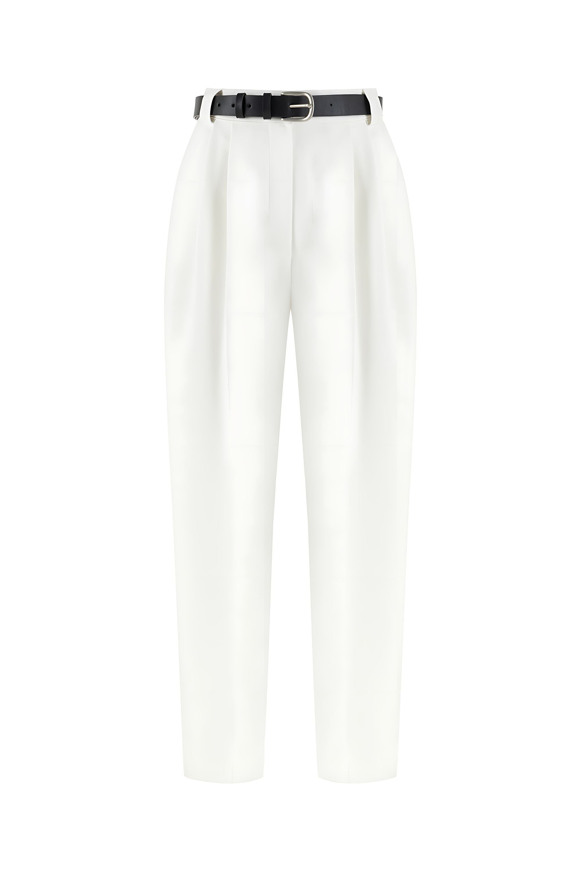Regular fit, full fit, unlined, double pleated on the front, leather belt detail at the waist, fly zipper, internal button hook closure, high waist pleated trousers with pockets