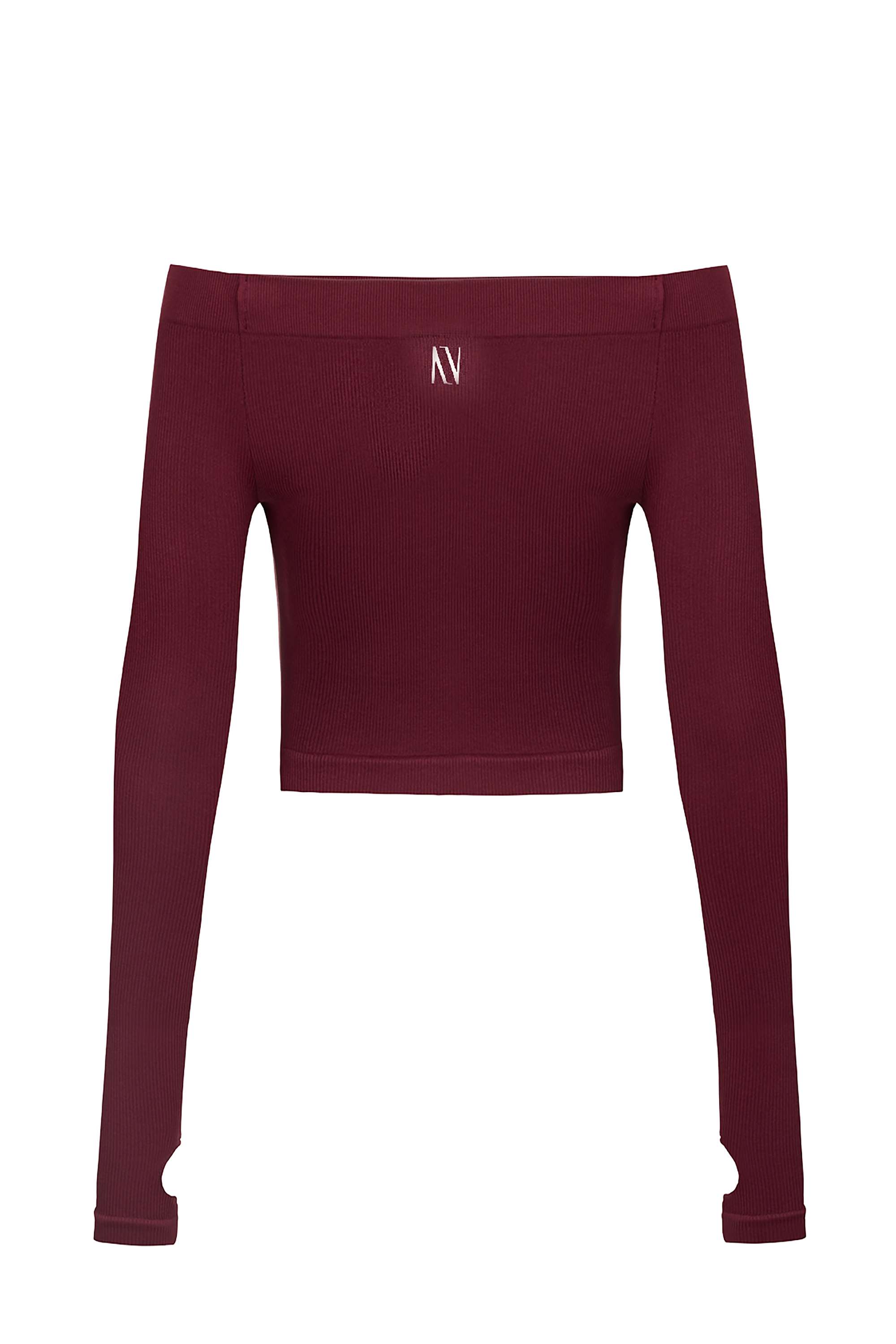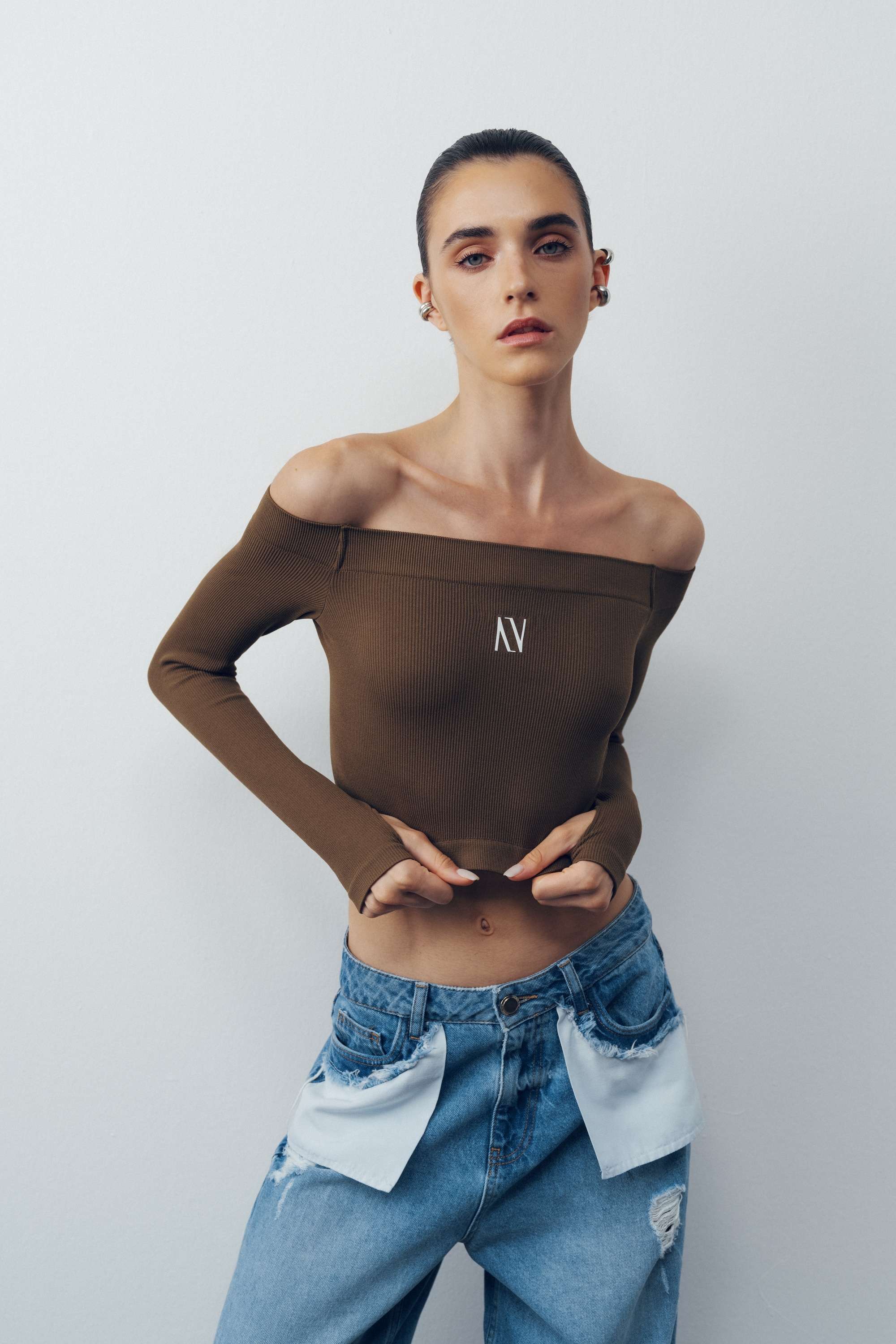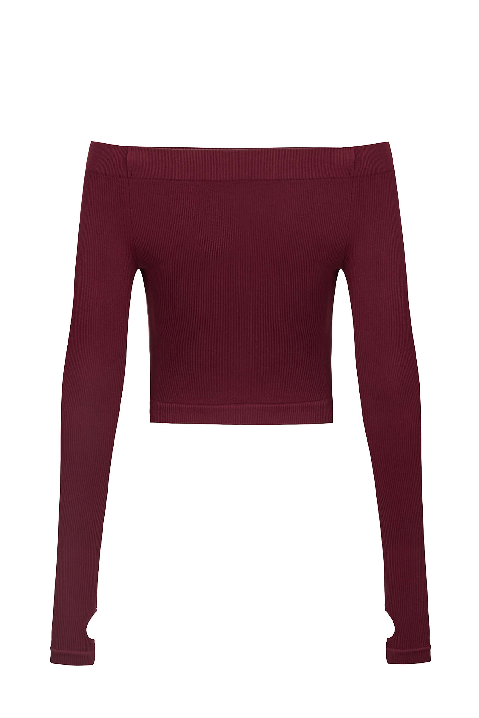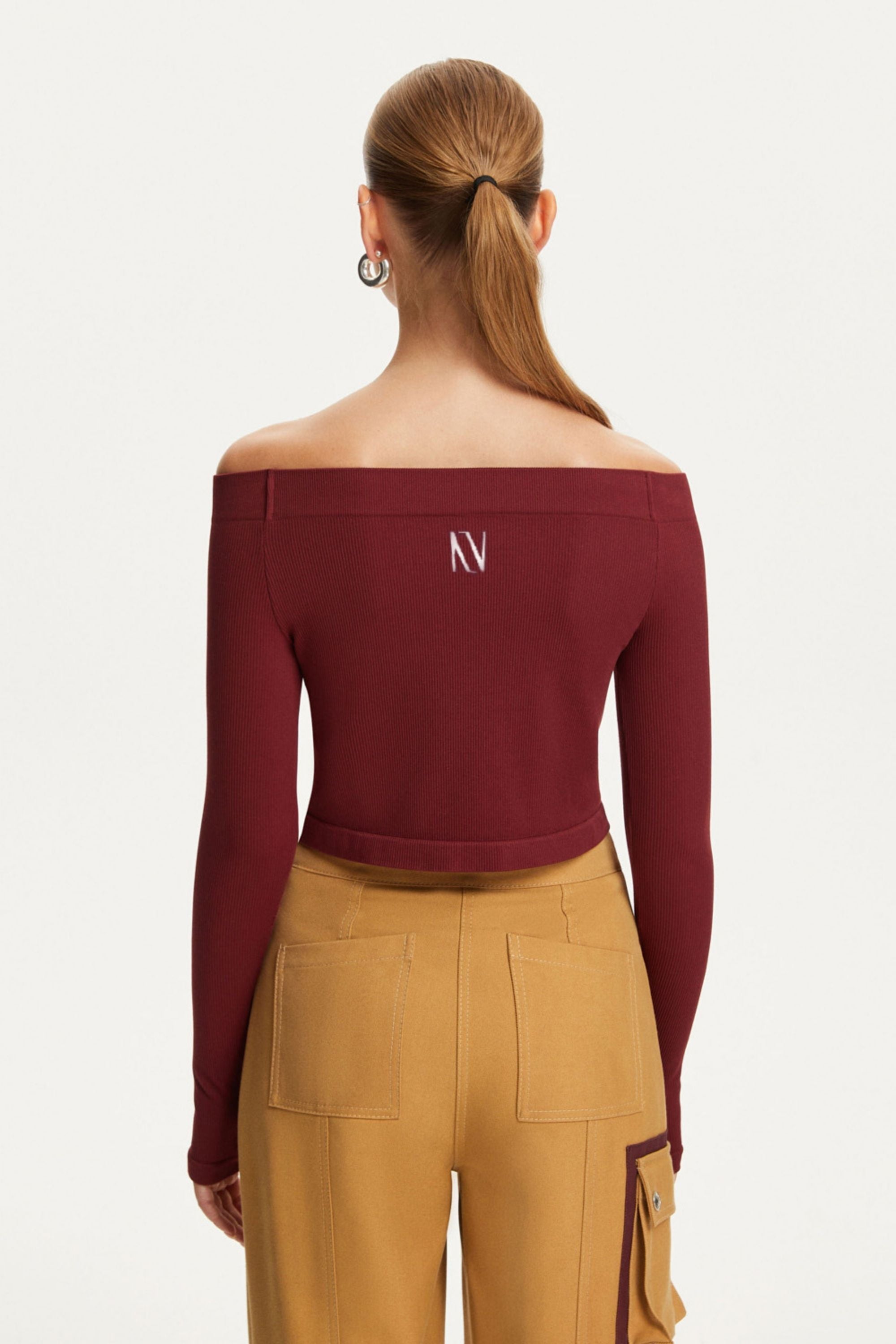 Reinvent your formal style in the metallic finish of this Nocturne jersey top. Off-shoulder neck long sleeve jersey crop top.
