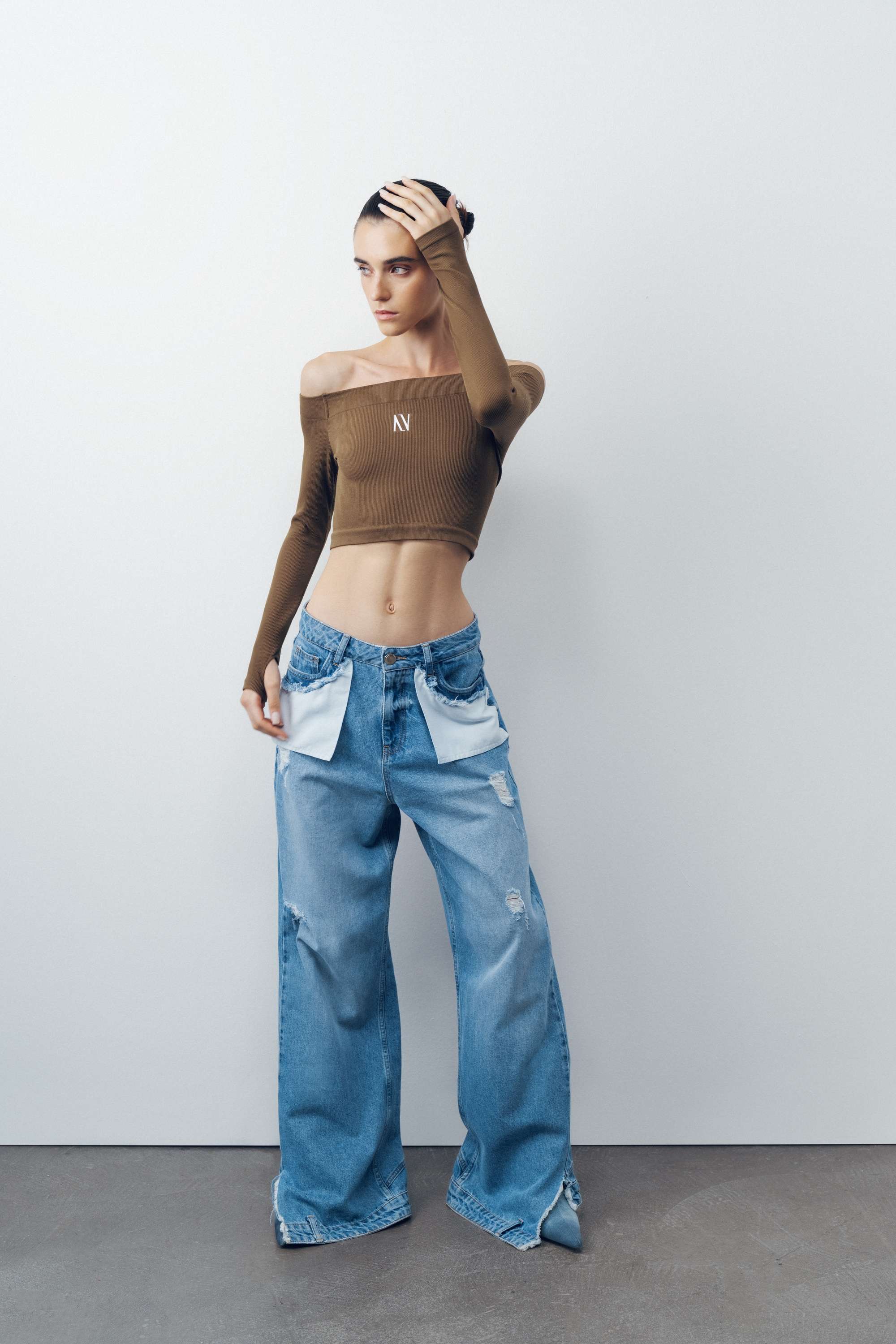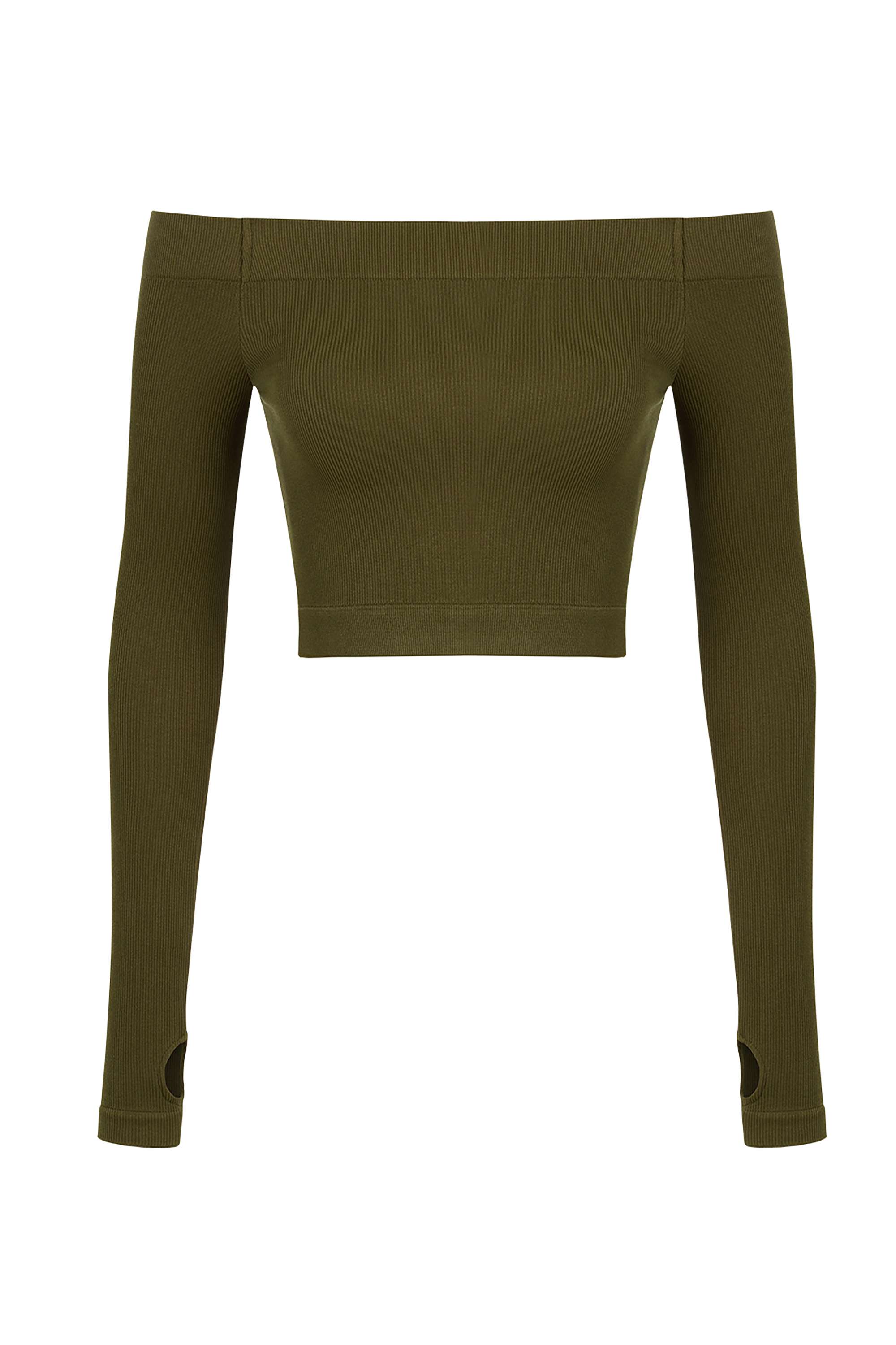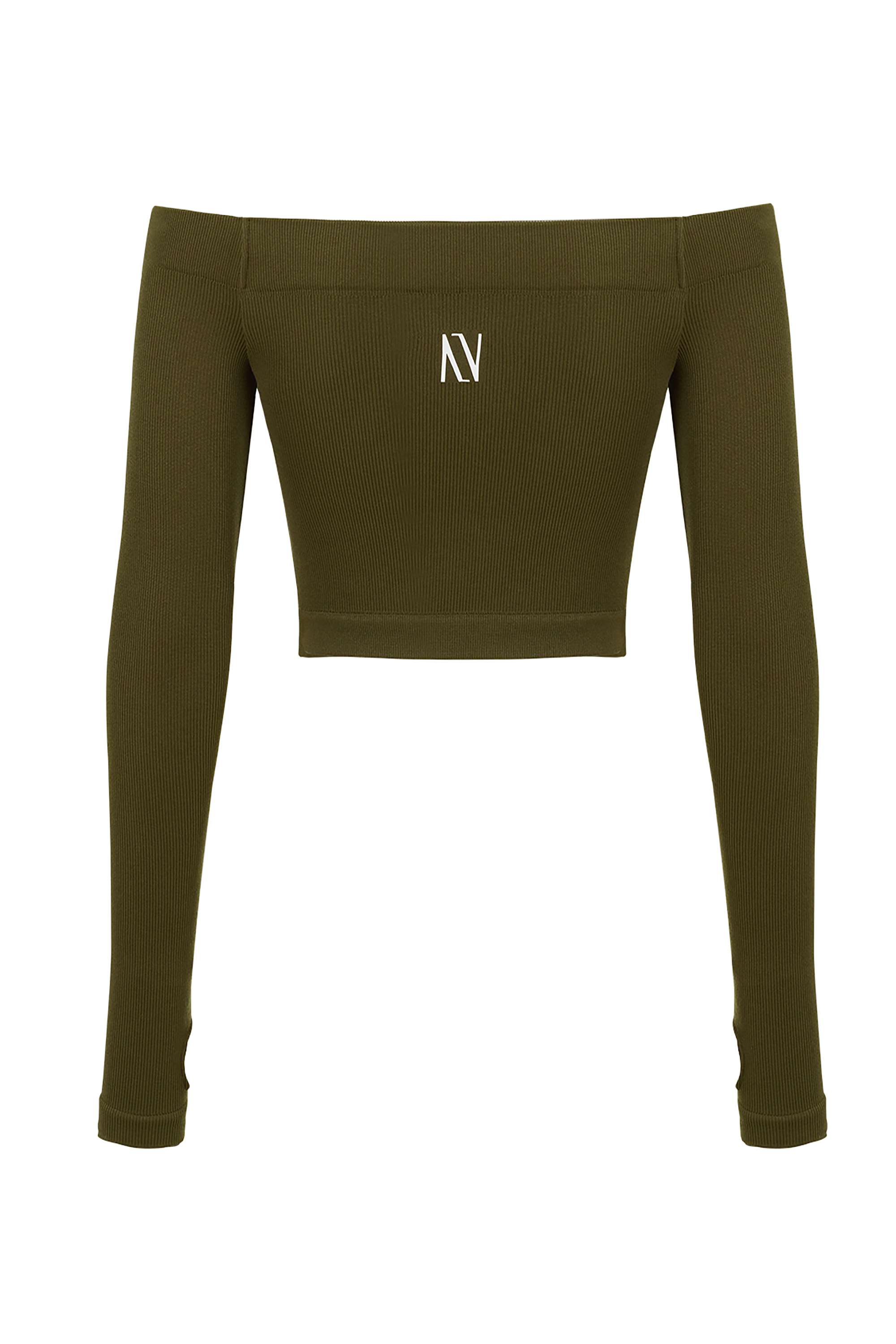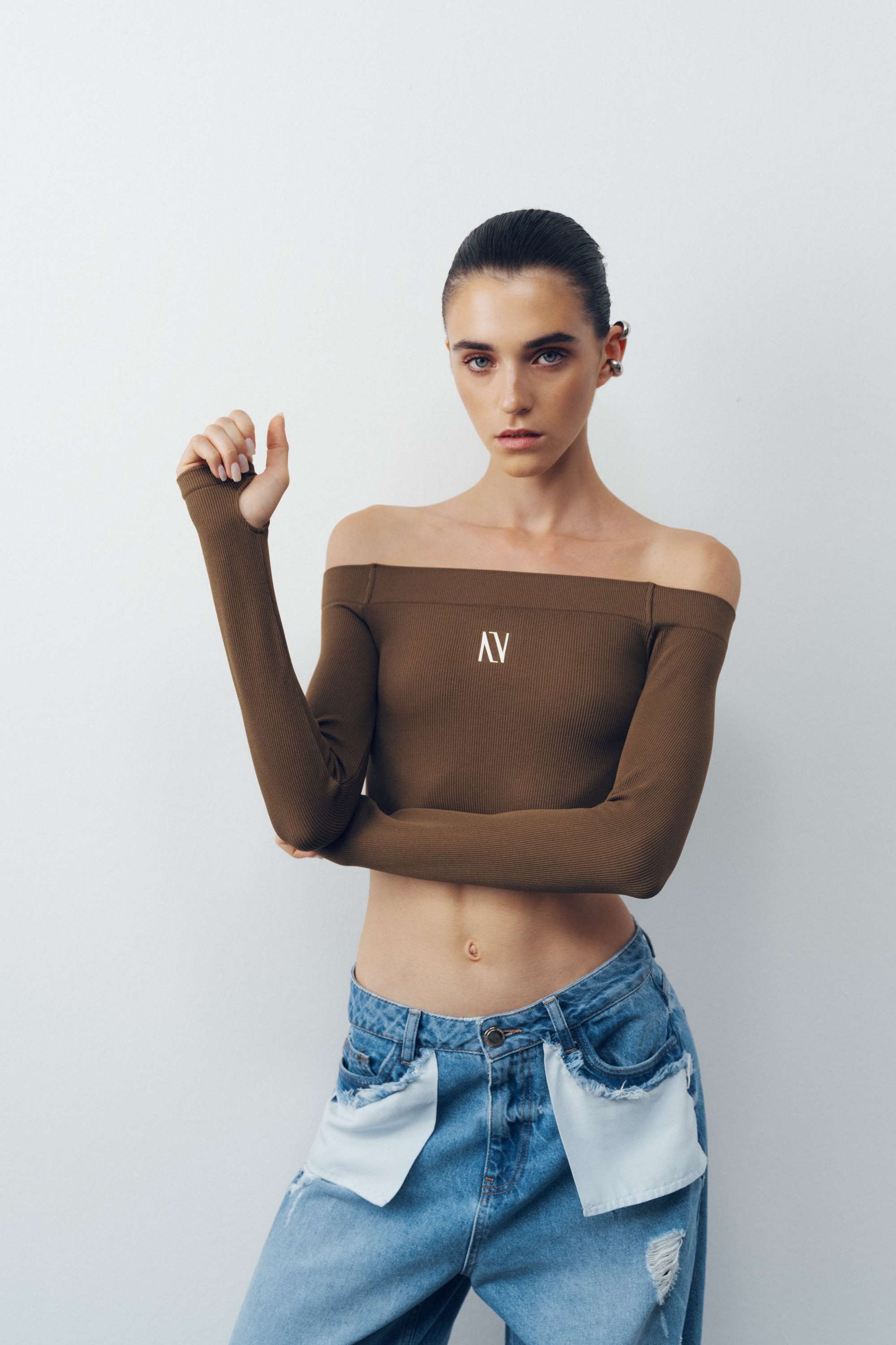 Reinvent your formal style in the metallic finish of this Nocturne jersey top. Off-shoulder neck long sleeve jersey crop top.