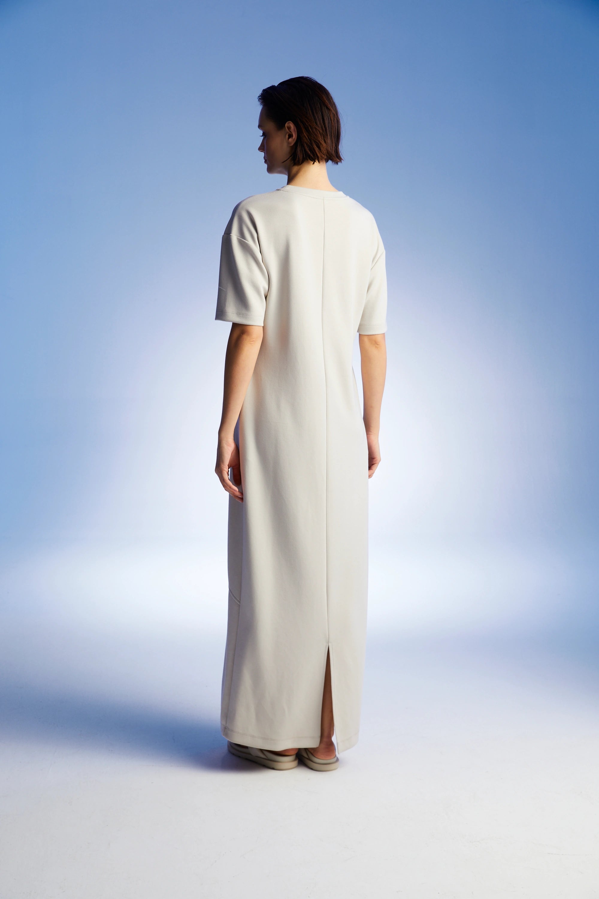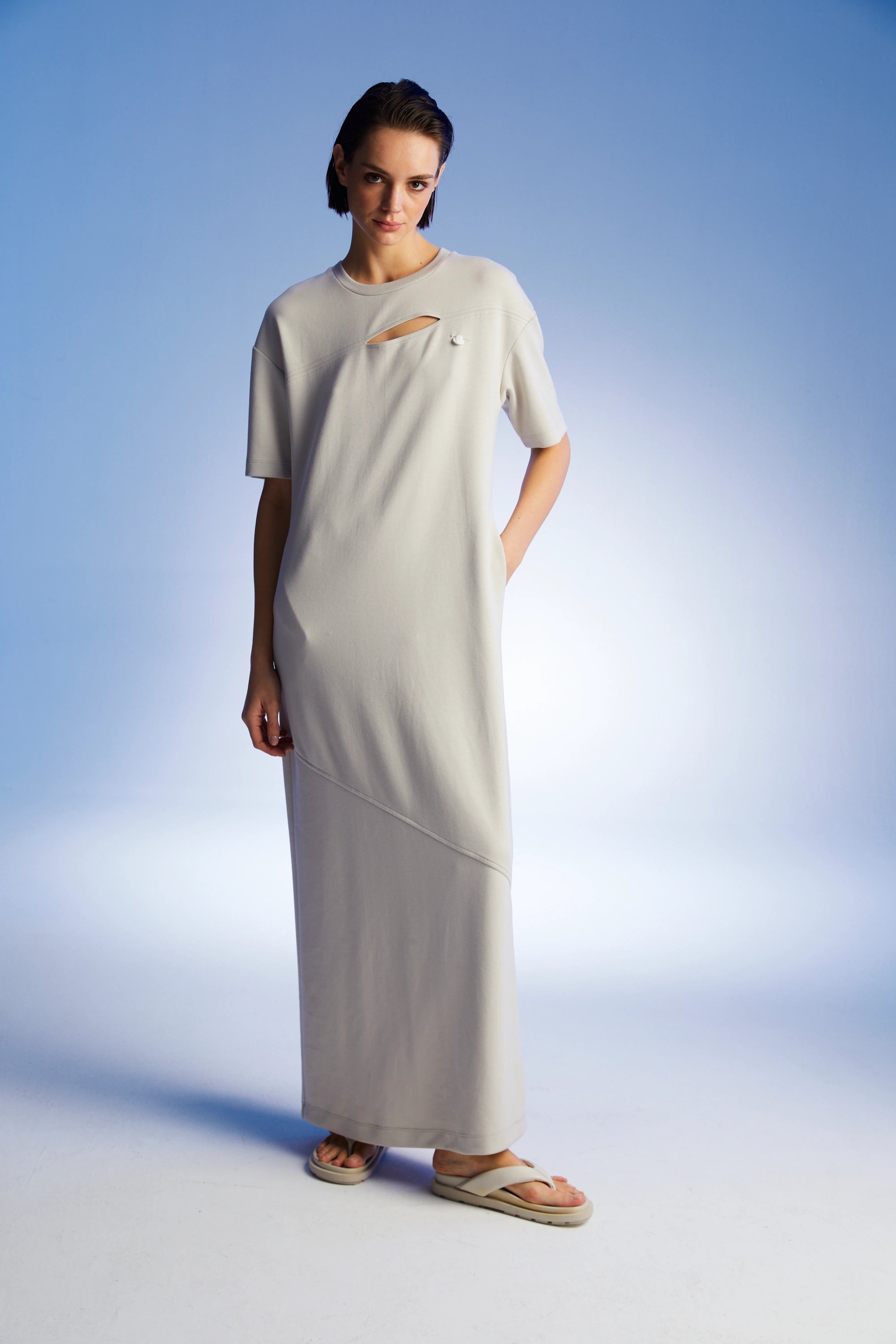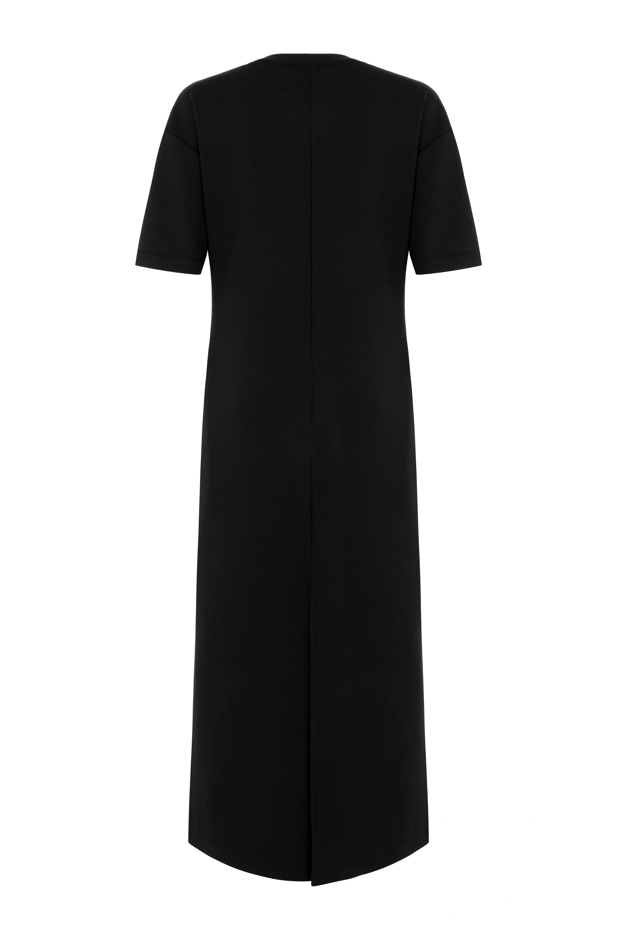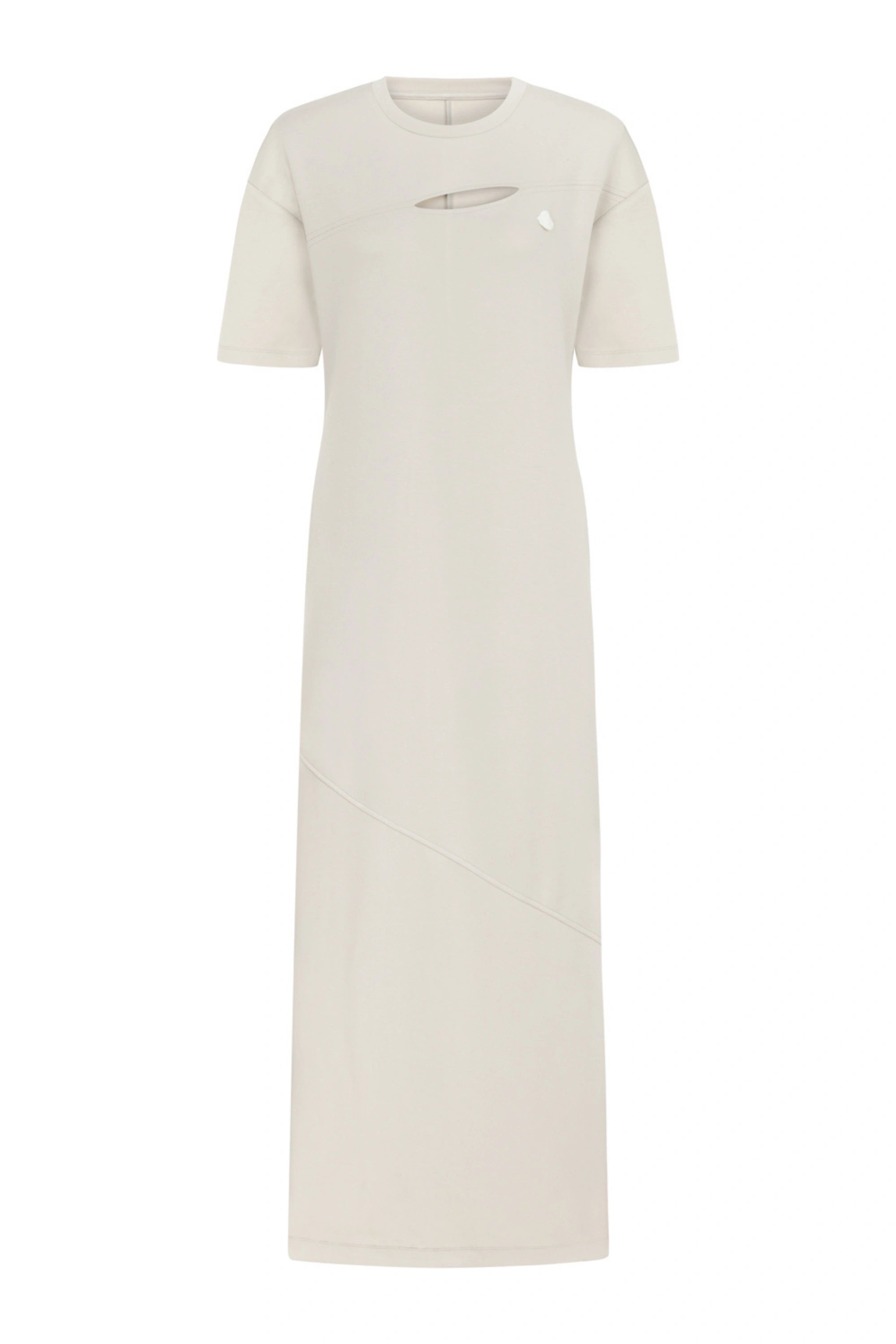 Round neck, short sleeves, long dress with window details
